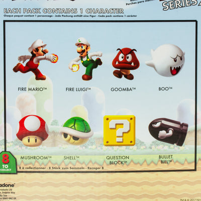 Queste etichette per zaino sono ispirate ai personaggi e agli oggetti dei giochi di "Super Mario" e possono essere attaccate a zaini, giacche e altri oggetti con la clip inclusa. Ogni confezione contiene una delle seguenti otto etichetteMario di fuoco, Luigi di fuoco, Goomba, Boo, Fungo, Guscio di tartaruga, Punto interrogativo o Pallottola.