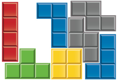 Nello specifico, ci sono 21 blocchi (6 blu, 6 grigi, 3 gialli, 3 verdi e 3 rossi) nelle forme tipiche.