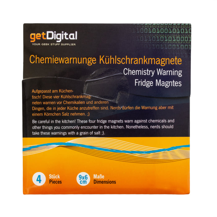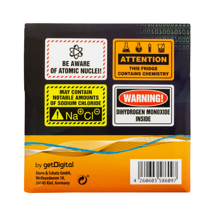 Con le calamite da frigo per avvertenze chimiche puoi anche combinare un sacco di guai in cucina a casa tua. Questo set contiene quattro magneti da frigo colorati che assomigliano a cartelli di avvertimento di un laboratorio di chimica e che mettono in guardia dalle seguenti cose: monossido di diidrogeno, chimica, cloruro di sodio e nuclei atomici.