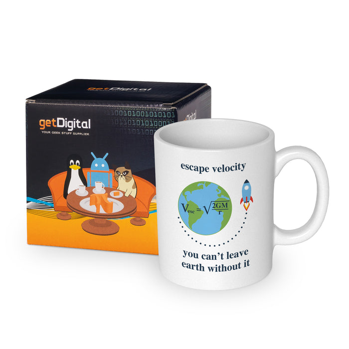 Vereinfacht gesagt: So schnell muss z. B. eine Rakete sein, um die Erde verlassen zu können. Die entsprechende Formel findest du auf dem Escape Velocity Becher. Dabei ist G die Gravitationskonstante, M die Masse und r der Radius des Himmelskörpers.