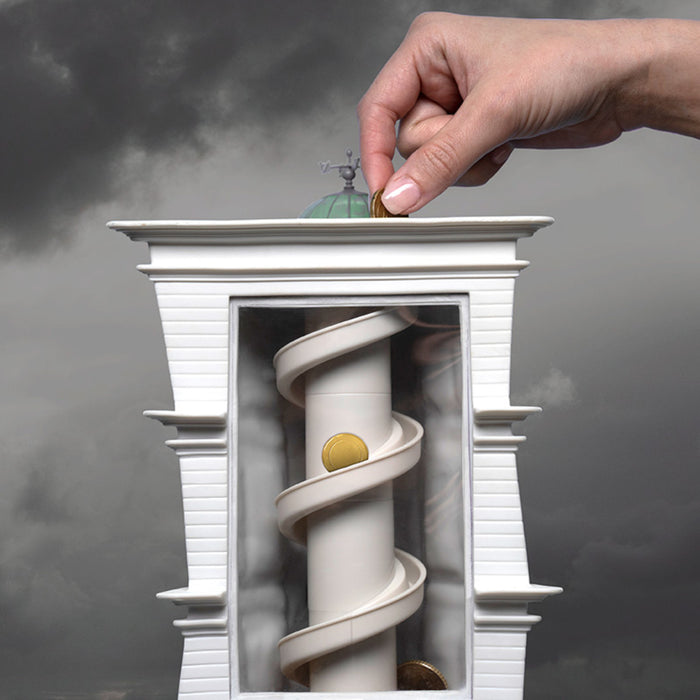 Le tue monete ora possono fare un viaggio altrettanto turbolento quando le lasci cadere nel salvadanaio della Gringotts Bank di Harry Potter. Le monete sfrecciano verso il fondo della scatola in diverse spirali e puoi anche vederle mentre vanno via. Grazie alla parete posteriore trasparente, puoi sempre tenere d'occhio la tua fortuna. La facciata, invece, è modellata sull'edificio originale della banca, che si erge maestoso sulla Winkelgasse. Quindi puoi essere certo che la versione piccola della banca farà colpo anche dal tuo scaffale. E nessuno oserà toccare i tuoi risparmi per paura di eventuali folletti in agguato all'interno.