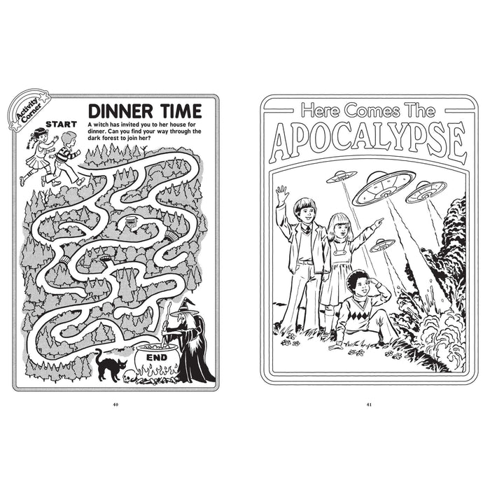 • Libro da colorare disegnato da Steven Rhodes nello stile retrò degli anni '70 e '80 con immagini e attività divertenti e spaventose