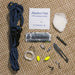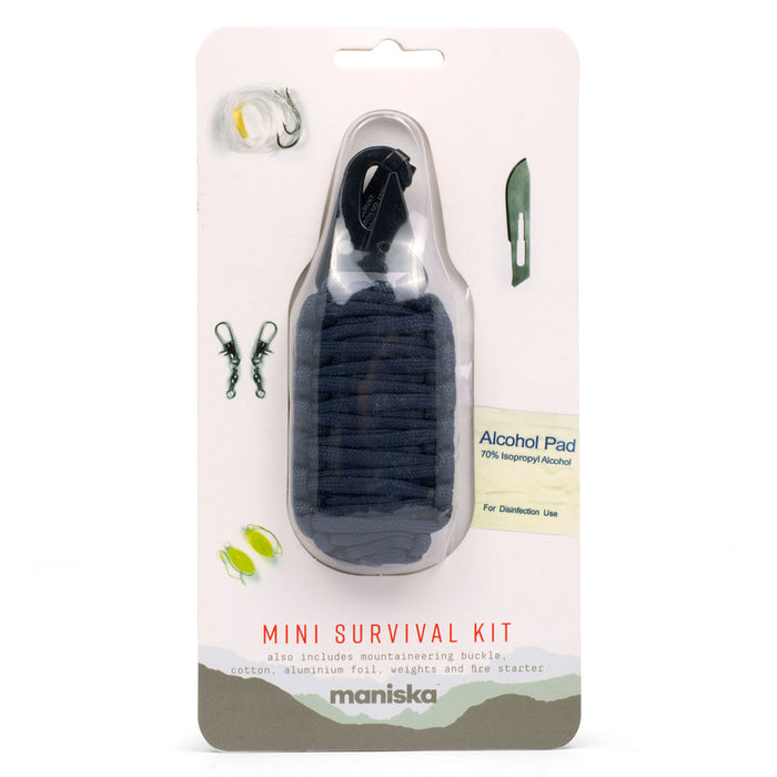 Contenuto: Corda da 3 m, fibbia da alpinismo, cotone, foglio di alluminio, cuscinetto ad alcool, pesi, girelle, lama di coltello, accendifuoco, amo da pesca, galleggiante, filo da pesca
